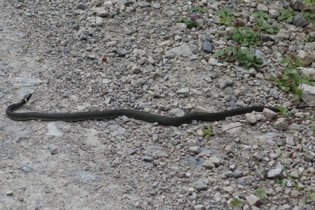 Nun geht es kräftig abwärts nach Brunnbach. Die Fahrbahn ist anfangs nicht besser als beim Aufstieg, also vorsichtig fahren! Diese Ringelnatter dreht lieber um. Weiter talwärts wird die Fahrt angenehmer.