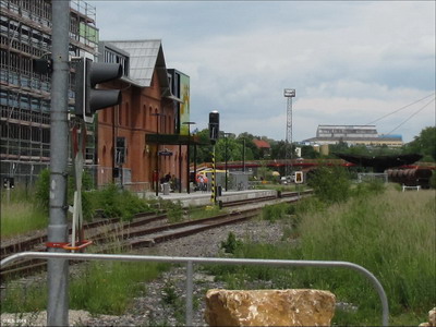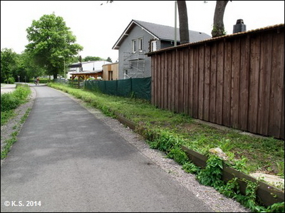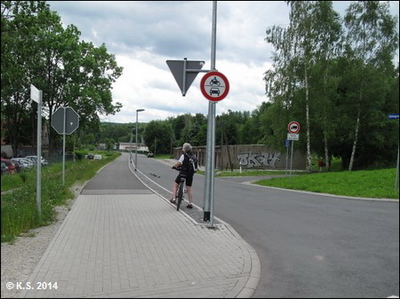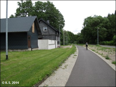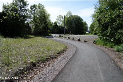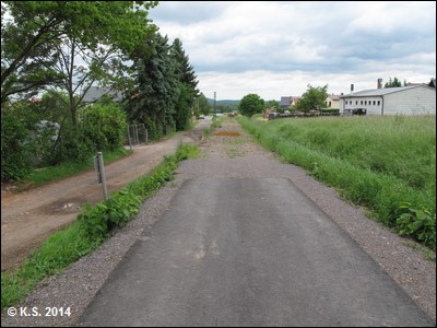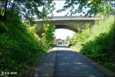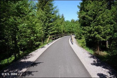 Nach der neuen Brücke geht es links hinauf auf die Trasse(Blick zurück) und weiter Richtung Haltepunkt Grenzhammer. Vorsicht an der (barrierefreien) Kreuzung, Stoppschild beachten!