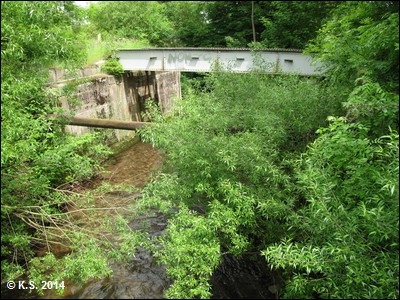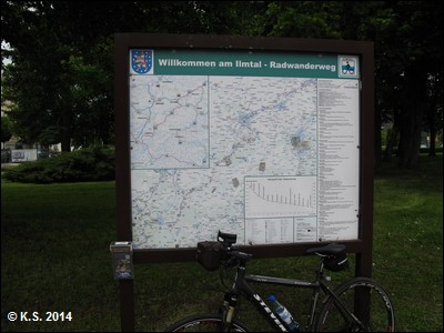 ...denn die folgende Bahnbrücke über die Ilm ist gesperrt. Am Abzweig folgt man der Beschilderung Richtung Langewiesen. Der Ilm-Rennsteig-Radweg verläuft hier noch zusammen mit dem Ilmtal-Radwanderweg flussabwärts. Das Logo des Ilm-Rennsteig-Radwegs fehlte aber 2014 noch.
