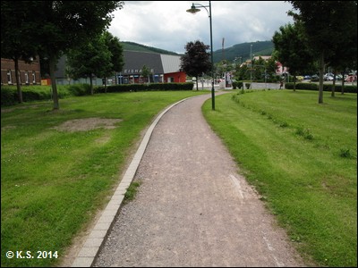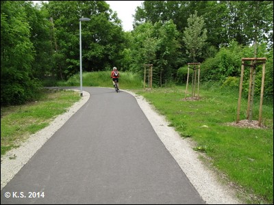 Auf geht`s, an der Eishalle vorbei. Im folgenden Grüngürtel an der Ilm ist die Trasse zunächst noch nicht ausgebaut (Blick zurück)....