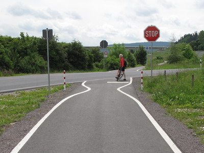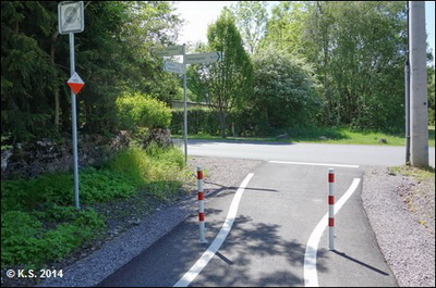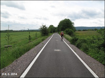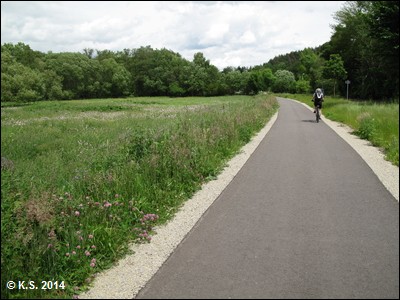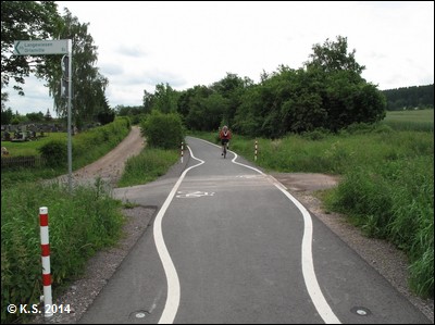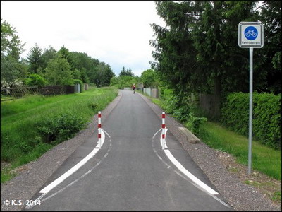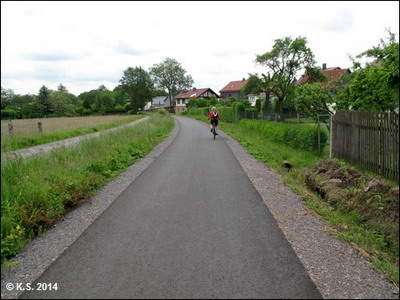 Die Beschilderung führt den Radler durch den Ort. Nach gut einem Kilometer trifft man wieder auf die Trasse.