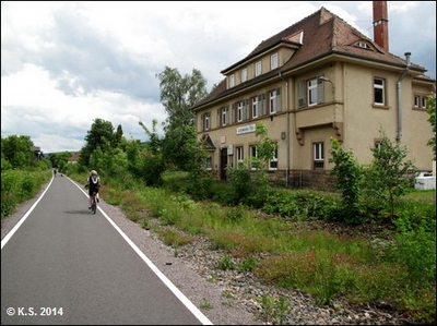 Am ehemaligen Bahnhof Neustadt-Gillersdorf (privates Wohnhaus) folgt eine kurze Umfahrung: den Wegweisern folgen (1 km).