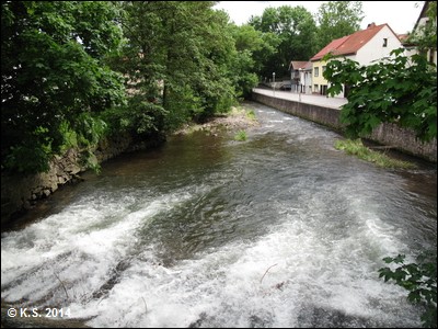 Der Radweg führt etwas oberhalb des Ortes entlang, der Fluss fließt mitten durch den Ort (Wegweiser nach links).