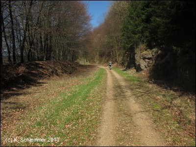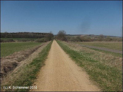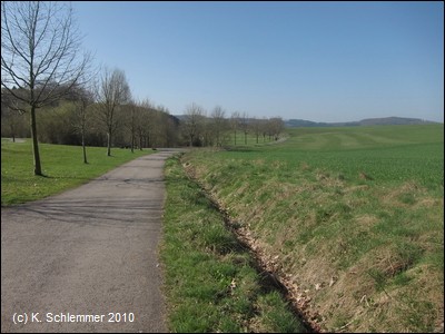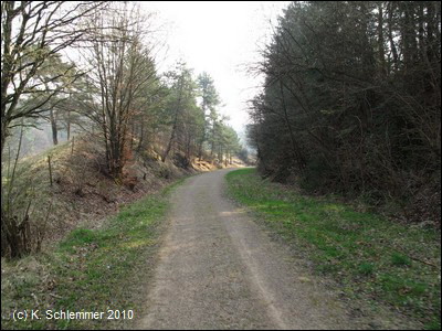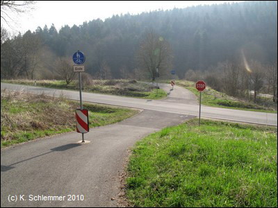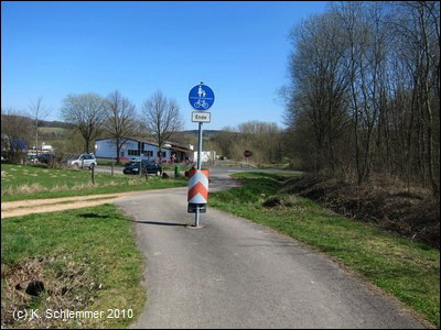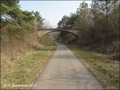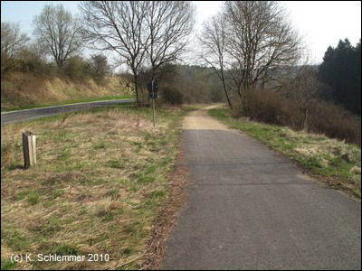Am westlichen Ende der Stadt, "Im Hundspesch", geht es auf die Trasse. Der Radweg ist hier nicht asphaltiert und verläuft parallel zur B-421.