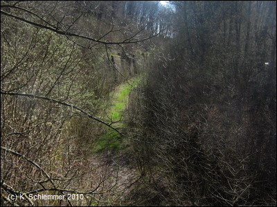 Am alten Bahnhof in Hillesheim. In einem tiefen Einschnitt führt die Schleife um die Stadt herum. (Blick von der Brücke Berndorfer Straße).