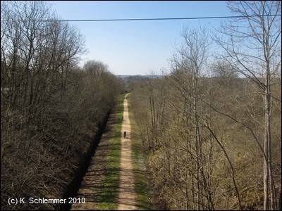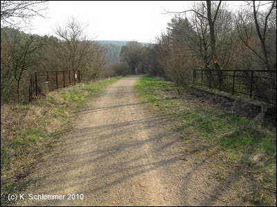 Der Radweg macht eine Schleife um den Ort, ein kurzes Stück ist asphaltiert. Es folgt ein unverkennbarer Bahntrassenweg.