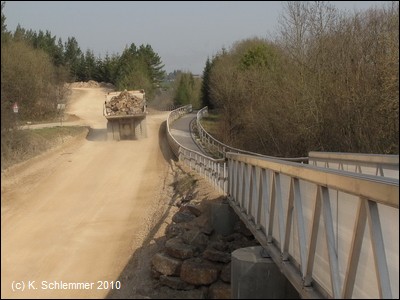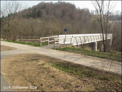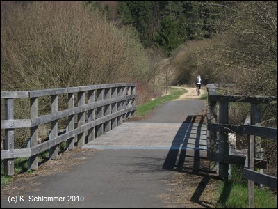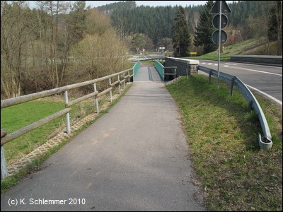 Die glatte Piste führt abwärts nach Ahütte. Wegen des Lastwagenverkehrs zu dem riesigen Kalkwerk hat man eine neue Metallbrücke für die Radler gebaut.