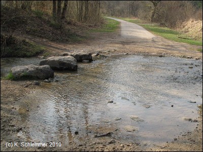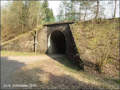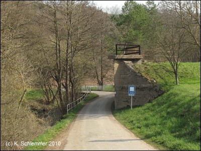 Doch schon beim Steinbruch Niederehe ist wieder Schluss mit der Bahntrassse. Nach dem Ort überqueren wir die Straße, passieren die Reste einer alten Brücke und folgen dem Niedereher Bach auf einem asphaltierten Wirtschaftweg.