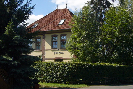 Der Bahnhof von Großtöpfer, außerhalb des Ortes, dient als Wohnhaus. Der Radweg biegt nach Osten ab und folgt dem Tal der Frieda aufwärts.