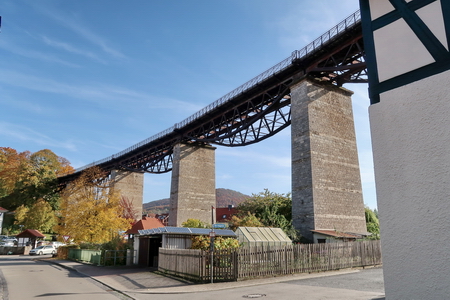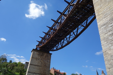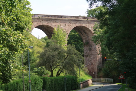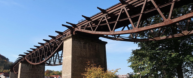 Wir müssen das Viadukt umfahren, aber vom Tal auserkennt man erst wirklich die Dimensionen dieses Bauwerks, das den gesamten Ort überspannt. 244 m lang und 23 m hoch ist das stählerne Monster, das 1877 -1879 erbaut wurde. Man erkennt an den Fischbauchträgern deutlich die zweite Gleisspur, die hier einst vorhanden war.