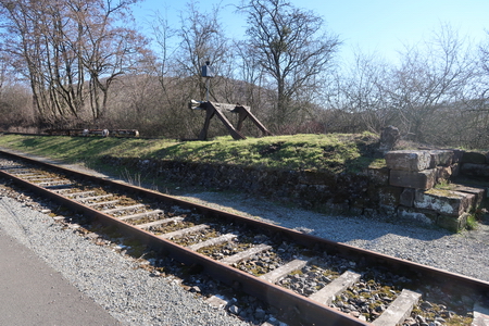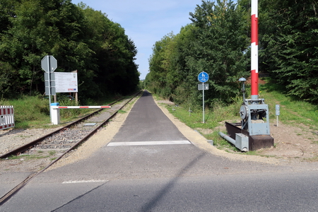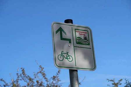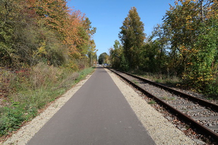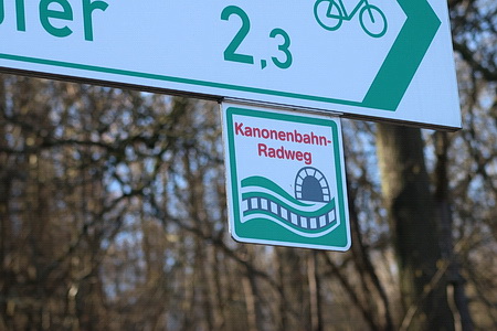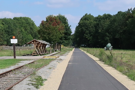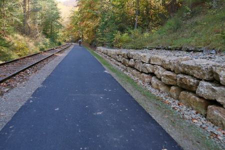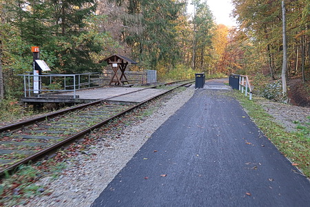 Direkt neben dem Gleis fährt man auf einer asphaltieren Fahrbahn nach Lengenfeld untern Stein. Vor dem Bahnhof, an einem Prellbock, wechselt der Kanonebahnradweg noch auf die andere Seite.