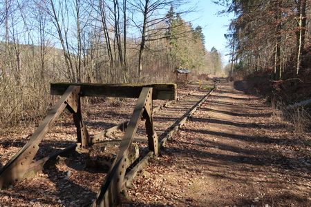 In Geismar enden die Schienen auf dem ersten Gleisbett und damit auch die Draisinenstrecke. Während der Radweg noch im Tal etwas weiter Richtung Lengenfeld verläuft, kann man die Bahntrasse vor dem Bahnhof Geismar vorbei verfolgen.