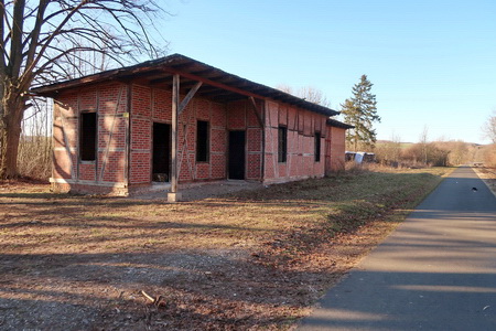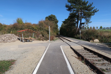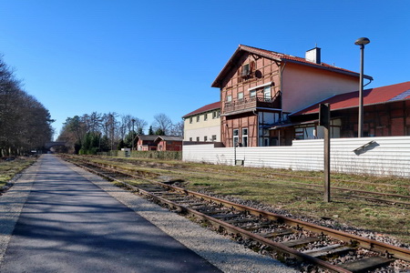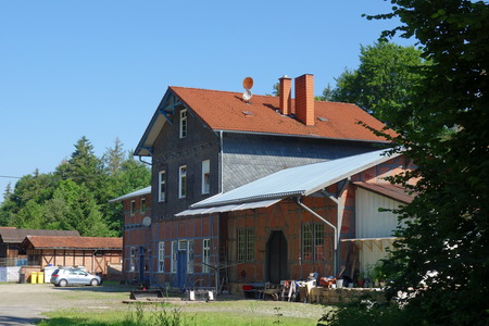 Der ehemalige Bahnhof ist ein privates Wohnhaus. Nach dem Bahnhof erreicht man den Draisinenwendeplatz mit den überdachten Rastbänken.