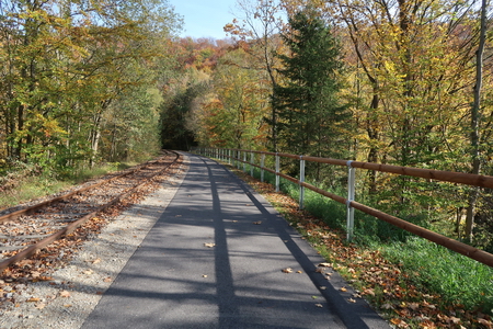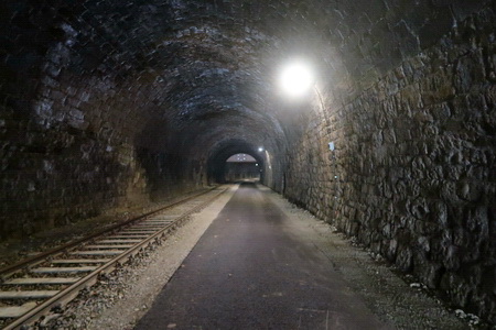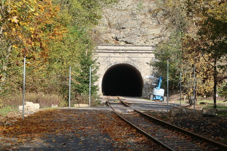Die Elektrodraisine, ausgelegt für größere Gruppen, kommt uns entgegen. Am Entenbergtunnel (288 m)steht noch ein einsamer Bagger, die Beschilderung des Radwegs ist noch nicht fertig.