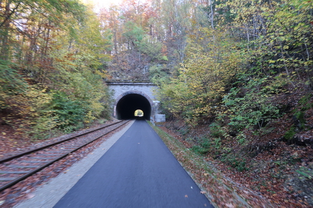 Vorbei am Haltepunkt Rottenbach durchquert man den Großen Mühlbergtunnel (343 m), Licht am Fahrrad kann nicht schaden. Es folgt der Haltepunkt Effelder, dann der kleine Mühlbergtunnel (155 m). Es ist der einzige kerzengerade Tunnel der Strecke.