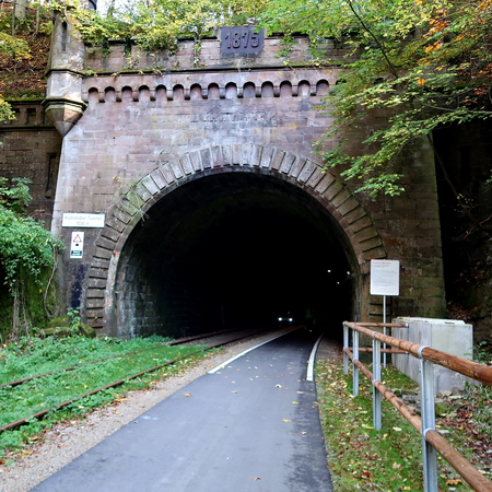 Nach dem Haltepunkt Luttergrund passiert man eine kleine Brücke. Es geht merklich weiter bergauf, vorbei am Haltepunkt Hübental. Dann taucht unvermittelt das Westportal des Küllstedter Tunnel vor uns auf.