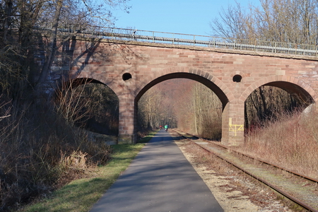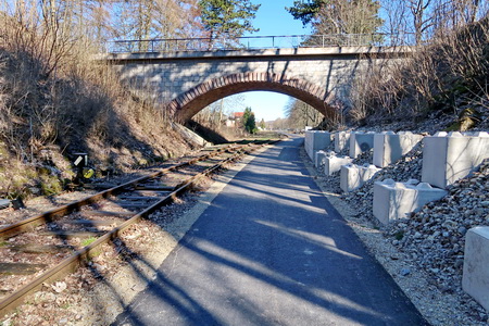 Die Fahrt geht weiter, Wo Anfang 2017 noch Gleise lagen, ist nun der fertige Radweg parallel zur Draisinenstrecke. An der kleinen Brücke waren aufwändige Arbeiten notwendig. Man fährt an den Fragmenten der alten Brückenpfeiler vorbei.