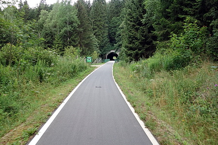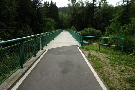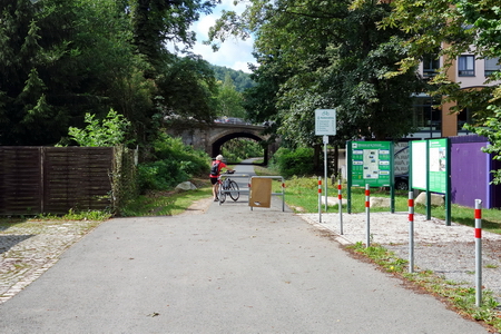 An einem kleinen Parkplatz findet man Informationstafeln zum Radweg. Die Straße muss überquert werden, es geht wieder auf die Bahntrasse. Noch eine Brücke, dann endete im Sommer 2015 der Radweg bei Wolfsgrün an der B 283.