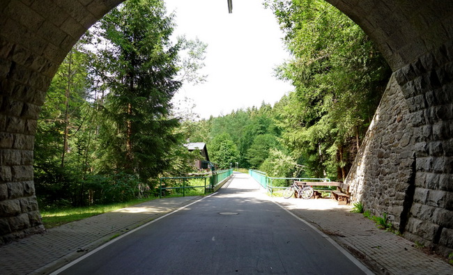 Schon der erste "Tunnel", ein Straßendurchlass (B101) an der Pfarrkirche St. Nicolai in Aue. Auf der breit asphaltierten Trasse geht es leicht bergauf Richtung Auerhammer.