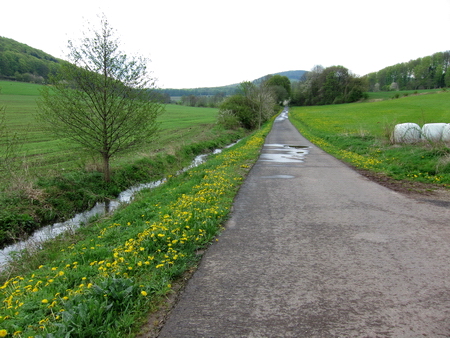 Auf der breiten Asphaltstrecke der ausgbauten Bahntrasse geht es nach Buttlar, vorbei an den originellen Ruhebänken. In Buttlar ist die Trasse nicht befahrbar (Industriegelände). Man muss die Bundesstraße 84 überqueren und dem Kirschweg bergauf folgen. Die nächste Querstraße ist bereits wieder die alte Bahntrasse. Rechts abbiegen Richtung Friedhof und Kirche (Michelsbergweg).