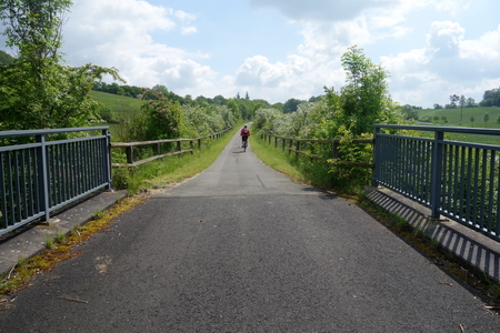 Durch die Berge der Vorderrhön vom Ulstertal ins Feldatal: Ein kurzer aber landschaftlich reizvoller Radweg auf der Trasse der ehemalige Bahnstrecke der Wenigentaft-Oechsener-Eisenbahn führt aus dem Ulstertal in die thüringische Rhön. Durch ein unverbautes Tal, immer am Hang entlang überwindet man mühelos den Anstieg durch die nördlichsten Berge der Rhön, deren erloschen Vulkane über 700 m in den Himmel ragen. Schon nach knapp 10 km endete die alte Bahnstrecke, die vorwiegend dem Abtransport von Bodenschätzen diente.