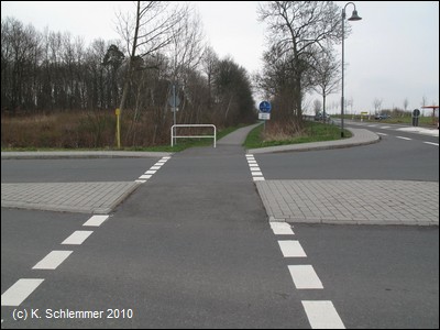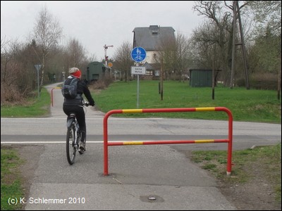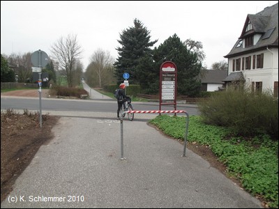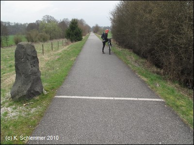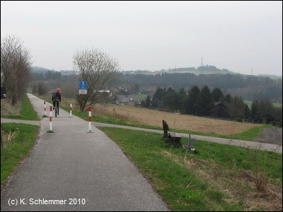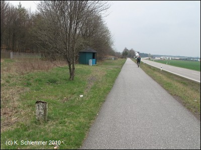 Wieder auf dem Radweg: Die Strecke knickt hier in einem großen Bogen nach Südosten ab. Entlang der B327 folgen wir der alten Bahnstrecke.