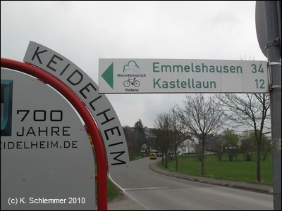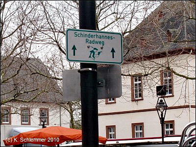 Vorbei am Bahnhof Ebschied. Beschilderung mit Schinderhanneslogo in Kastellaun.