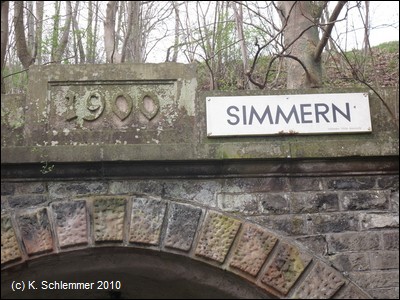 Auf der Südseite liegt das Hotel Waldschlösschen. Auf einer alten Brücke geht es über den Simmerbach, am Klärwerk vorbei.