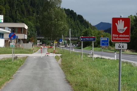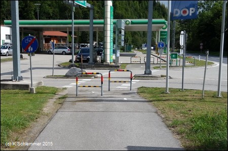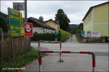 An der kleinen Querstraße in Molln muss man aber dann doch absitzen: Sperren, Umfahrungsspuren! Das könnte man besser hinkriegen. Nun geht es ein Stück lang durch ein Wäldchen, geradeaus bis in die Bahnhofstraße.
