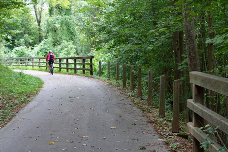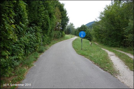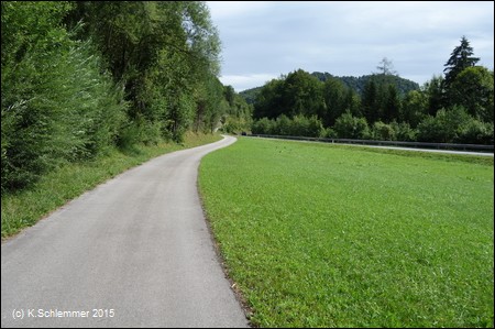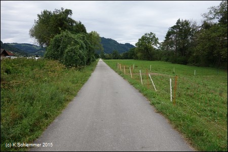 Danach wird die Strecke richtig schön! Durch die Wiesen und am Hang entlang hoch oberhalb der Straße verläuft der Radweg, wahrscheinlich auf der Bahntrasse.