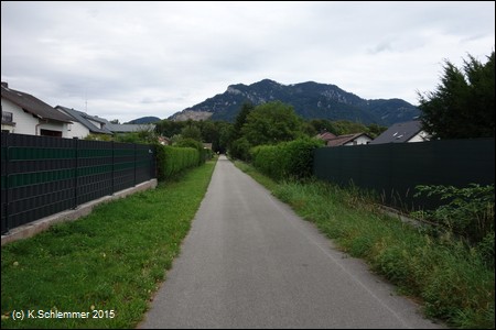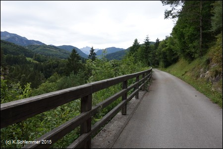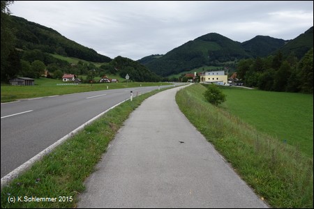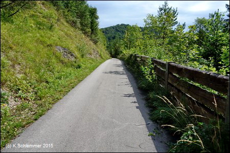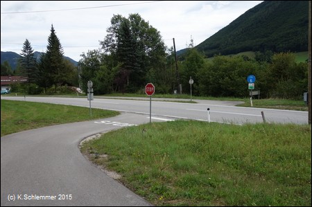 Nach Überquerung der Bundesstraße (Blick zurück) folgt man weiter den Wegweisern des R8 (Steyrtalweg), auch hier ist die ursprüngliche Bahntrasse offensichtlich zerstört.
