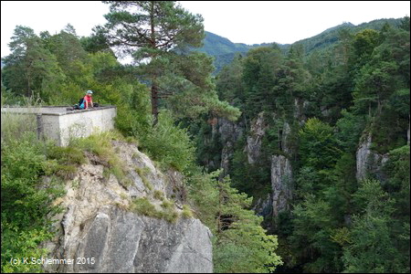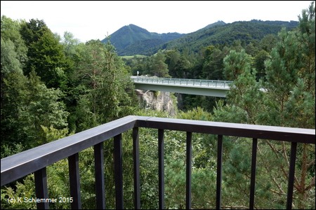 Wir befinden uns hoch über der Steyr, am Steyrdurchbruch. Gegenüber erkennt man die große Brücke der B140, 205 m lang und 35 m hoch. Wir fahren über die Bogenbrücke des Radwegs...