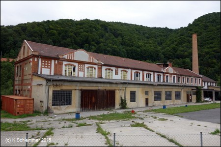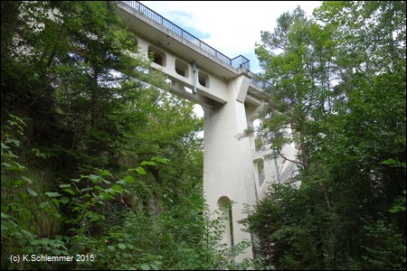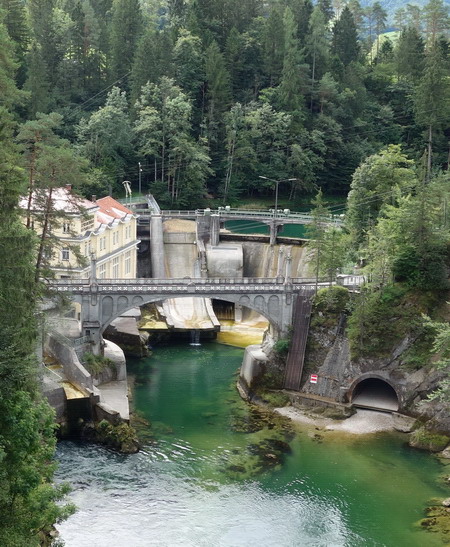Der Fluss zwängt sich durch die enge Schlucht. In der Gegenrichtung erkennt man in der Tiefe das alte Kraftwerk.