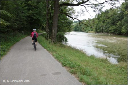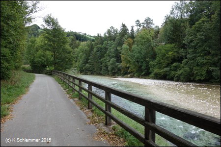 Am Ufer entlang und an der alten Haunoldmühle vorbei (re Bild Blick zurück)