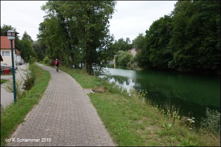 Der Radweg führt direkt oberhalb des Flusshangs entlang und durchquert dann schnurgerade die Ansiedlung.