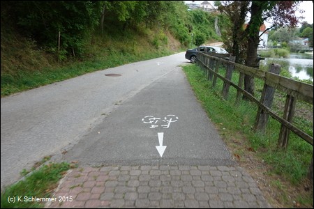 Der Radweg verläuft nun am Hang zwischen Straße und Fluss, die Geländer sichern die Strecke nicht immer optimal.