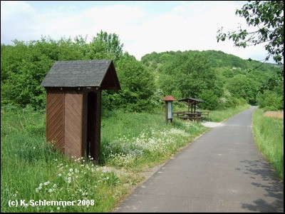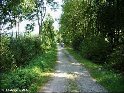 Der Scheitelpunkt der Strecke bei 427 m über NN ist erreicht. Hier beginnt der 7,5 km lange neueste Abschnitt des Radweg auf der Bahntrasse, der 2011 fertiggestellt wurde. Die Strecke ist nicht asphaltiert, sondern hat eine wassergebundene Oberfläche.