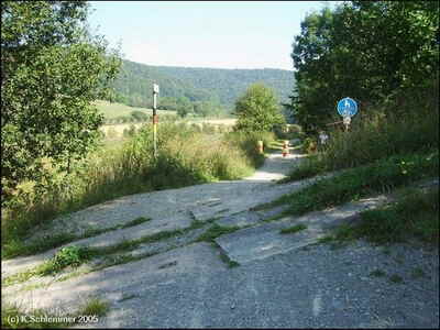 Weiter auf dem Radweg bis zur Feldmühle, dort muss die B250 muss überquert werden. Dann geht es hinauf auf die Bahntrasse. Auf diesem (hessischen) Abschnitt besteht die Fahrbahn aus einem ruppiger Kiesbelag. Die ehemalige DDR-Grenze ist erreicht. Vorsicht beim Überqueren der Betonplatten des früheren Kolonnenweges.