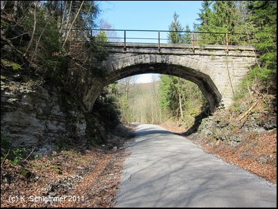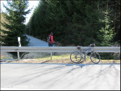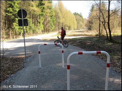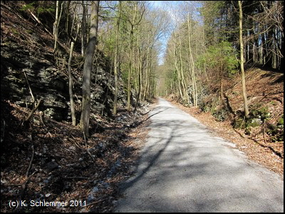 Hier war im April 2011 noch die Leitplanke im Weg. Dahinter beginnt ein wunderschöner Bahntrassenradweg abwärts durch den Wald.