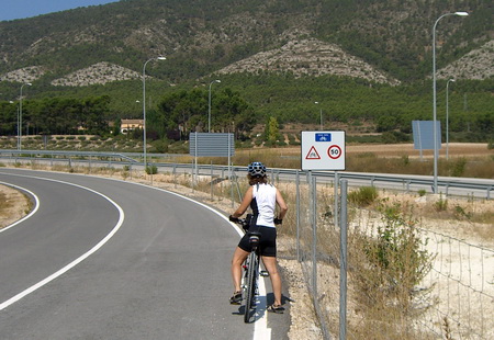 Es wird Zeit, auf die Straße auszuweichen, die Vía Verde ist zu Ende. An der Straße nach Xixona (CV-800) ist eine gute Gelegenheit. Ansonsten ist die Rückfahrt auf der Vía Verde ins Tal eine gute Option.