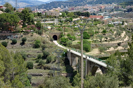 Die Stadt Alcoi war einst ein wichtiger Standort für verschiedene Industriezweige. Textil-, Papier- und metallverarbeitende Industrie waren dort angesiedelt und benötigten die Eisenbahn für den Transport ihrer Produkte. Die Stadt liegt in einer zerklüfteten Berglandschaft und der Bau von Verkehrswegen ist dort sehr aufwändig. Wegen der Schluchten, die die Stadt durchziehen, hat Alcoy auch den Namen "Stadt der Brücken" erhalten. Die vorhandenen Schmalspurbahnen schienen der Industrie jedoch nicht ausreichend, und man begann deshalb den Ausbau einer 66 km langen regulären Bahnverbindung zum Hafen von Alicante. Der Spanische Bürgerkrieg beendete die einstigen Pläne, zurück blieben die teilweise fertigen Strecken und Bauwerke wie Tunnel und Brücken.