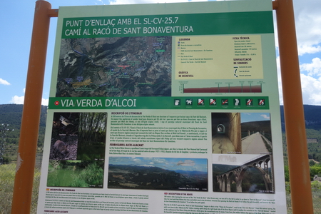 Dieser Radweg verläuft auf der Trasse einer geplanten Verbindung zwischen Alcoi und Alicante. Als Radweg ausgebaut ist der ca. 12 Kilometer lange Abschnitt zwischen Alcoy und der Ansiedlung La Sarga, einem Ortsteil von Xixona. Von dort aus ist die Trasse zwar teilweise befahrbar (Feldweg), aber nicht gepflegt oder beschildert. Teils ist die Trasse zugewachsen oder überbaut. Die Strecke führt über Ibi und Castalla auf Service-Wegen und Nebenstraßen bis zum Pass "Puerto del Maigmó". Dort beginnt die Via Verde del Maigmó auf der gleichen Bahnlinie (Alcoi - Alicante), die nie in Betrieb war, sondern deren Fertigstellung in den Wirren des Spanischen Bürgerkrieges unterging. 14 Tunnel und 3 Viadukte sind Teil der Strecke, die Tunnel waren einst sämtlich gut beleuchtet, im April 2016 waren die Lichtanlagen in den beiden langen Tunneln (je ca. 1 km) defekt, eine Beleuchtung am Fahrrad ist unerlässlich.