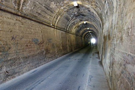 Die halbseitig asphaltierte Strecke führt stadtauswärts auf die Berge zu. Schon bald erreicht man den ersten Tunnel (von 10).