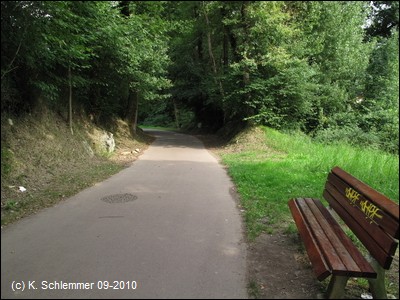 Die Straße wird überquert, es geht nun etwas stärker aufwärts. Die Bahntrasse ist unverkennbar.