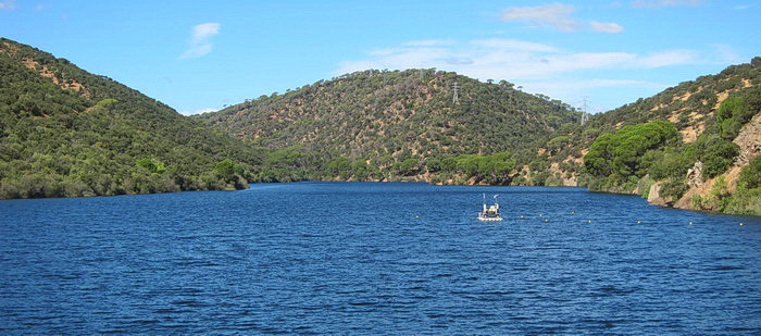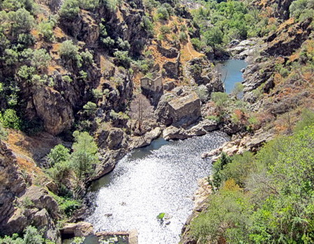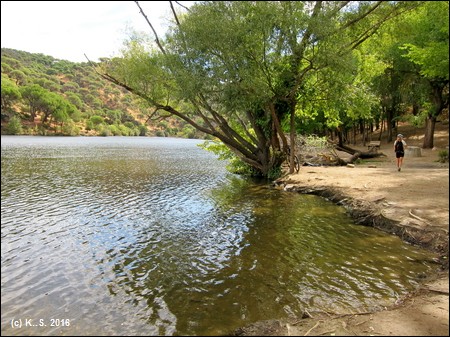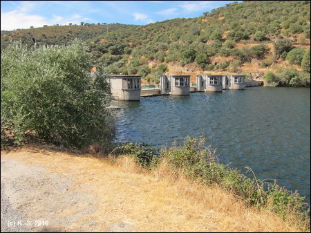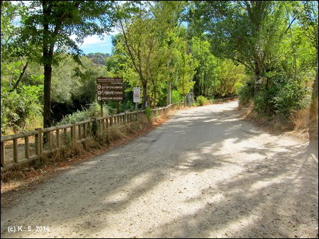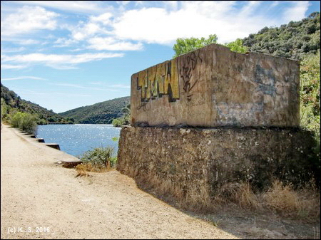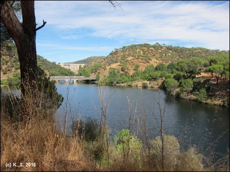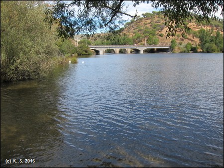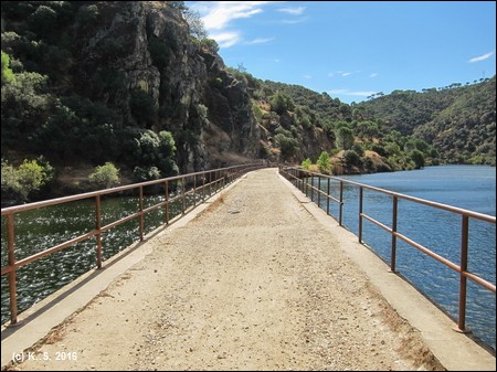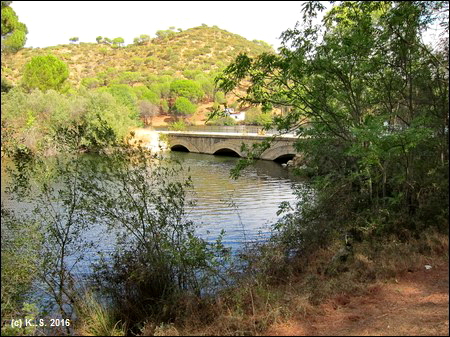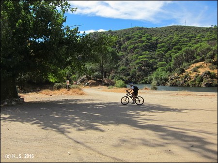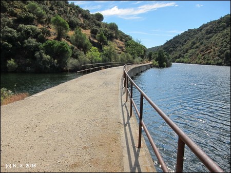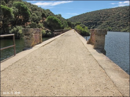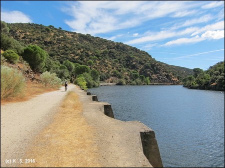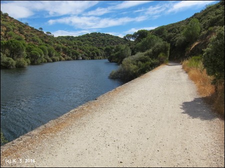 In der Gegenrichtung kann man der Trasse über die kleine Brücke noch ein Stück folgen, aber noch vor der Straße übernimmt das Dickicht! Der Radweg aber führt weiter flussabwärts. Der Blick zurück über den Fluss lässt noch die Staumauer des höher liegenden Stausees von San Juan erkennen.