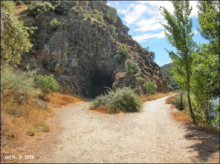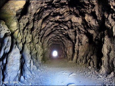Dann liegt der einzige Tunnel dieser Strecke vor uns: Ein grob aus dem Felsen gehauener Stollen.