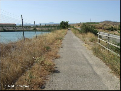 Viel Wasser führt der Fluss im September nicht. Wir verlassen die Ufer des Cidacos und biegen rechts ab auf die Bahntrasse. Als staubiger Weg führt die Bahntrasse zurück nach Arnedo, eine Alternativroute!