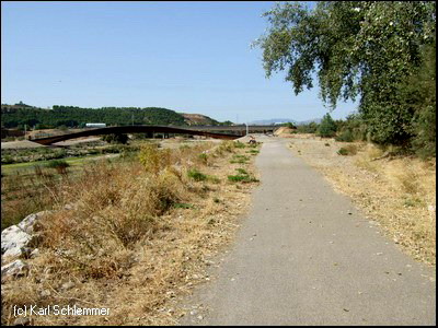 Im Parque del Cidacos, am südwestlichen Rand von Calahorra nahe der Autobahn AP-68, beginn der Radweg durch das Flusstal mit ganz geringer Steigung, zunächst Richtung Südwesten am linken Flussufer entlang. Eine neue Holzbrücke zweigt auf die andere Flussseite ab, wir fahren geradeaus unter der Autobahn durch.