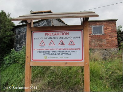 Die Reste der alten Grube. .....und ein Schild des Jakobswegs. Von hier aus in östlicher Richtung liegt die Bucht von La Arena (Vía Verde Montes de Hierro). Über die Via Verde.. Paseo de Itsaslur, die nur knapp einen Kilometer weiter beginnt, erreicht man nach 2,2 km den Strand und den Radweg in die Bucht von Bilbao.