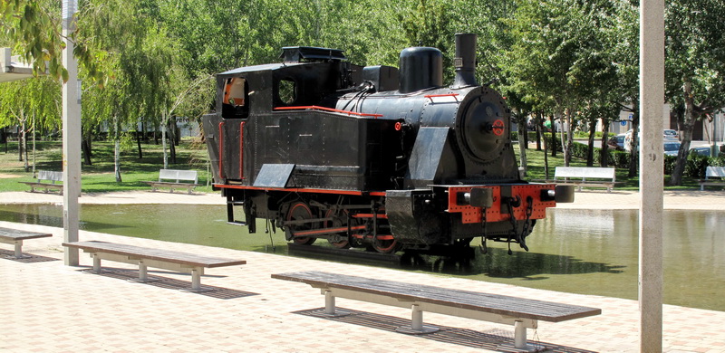 An einem Park links des Weges steht eine alte Lokomotive. Auf dem grünen Radweg erreicht man schnell den Bahnhof von Tudela.